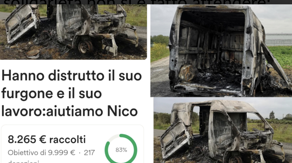 Nicola ha sempre lavorato con impegno e sacrificio per costruirsi un futuro. Il suo furgone era il cuore della sua attività. “Quello che è successo non è stato un semplice atto di vandalismo, ma un atto criminale di grande crudeltà: hanno rubato il suo furgone, il suo investimento per poter lavorare, e poi lo hanno dato alle fiamme. Ma non hanno bruciato solo il suo mezzo, hanno distrutto il suo lavoro e ora si trova senza strumenti per poter continuare”. Un lavoro come corriere, la fidanzata prosegue: “Per questo, anche se con un po’ di imbarazzo, ho deciso di lanciare questa raccolta fondi, vogliamo aiutarlo a ricominciare, a coprire almeno una parte del danno”. E il popolo della solidarietà non si è fatto attendere: tramite https://gofund.me/b64ae1ac sono già 8.300 mila euro i fondi raccolti.