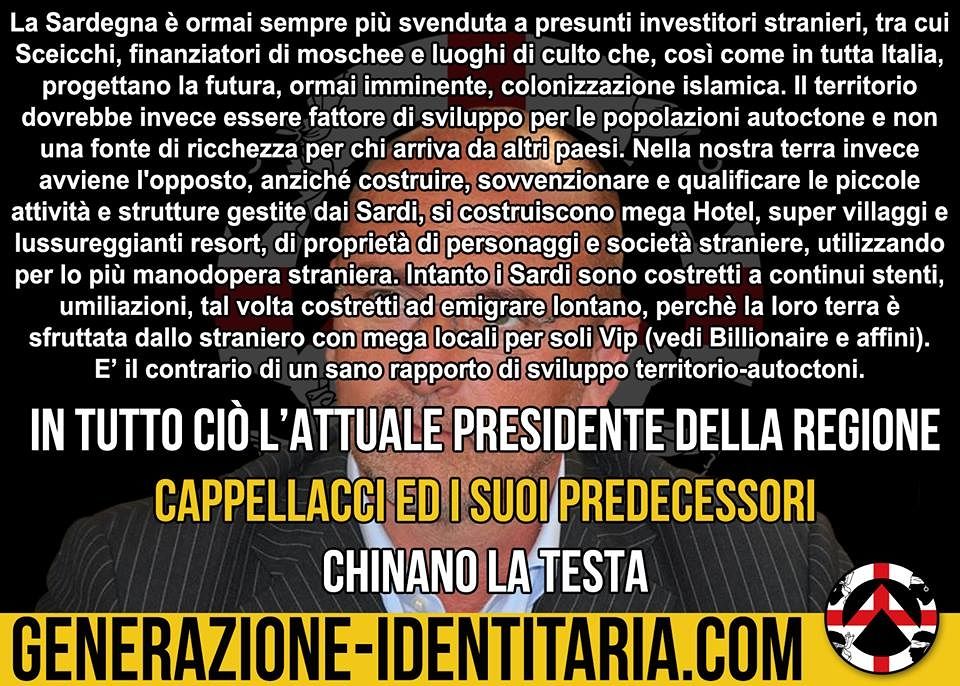Ma soprattutto andiamo contro chi sta distruggendo la Sardegna e gli altri popoli europei con le società multietniche”.Hanno una pagina Facebook regionale dove trovare altre informazioni(https://www.facebook.com/GenerazioneIdentitariaSardegna9 Il gruppo nasce su base europea : “Gli identitari sono dunque coloro che considerano la preservazione delle identità di fronte al rullo compressore mondialista come una missione storica del nostro tempo. Noi leviamo dunque la bandiera dell’identità contro la mondiale uniformità massificante”.