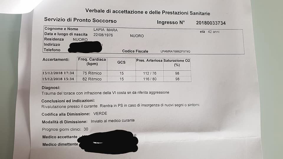 Giallo sul pestaggio della deputata Maria Lapia del M5S: “Gravi menzogne, ecco come sono stata aggredita”. La deputata del M5S, dopo l’audio di una donna circolata in mattinata che smentiva la gravità dell’episodio, pubblica su Fb il referto medico. E afferma: “Bastava chiamarmi, come vuole ogni buona regola deontologica, ed avrei fornito il referto medico che pubblico togliendo solo alcuni dati sensibili. Tutti possono leggere quello che ho subito. Il referto medico parla chiaro con una prognosi di 30 giorni ed un “trauma del torace con infrazione della VI costa sinistra da riferita aggressione”. L’esame radiologico, poi, parla di “infrazione traumatica della VI costa sinistra”.
