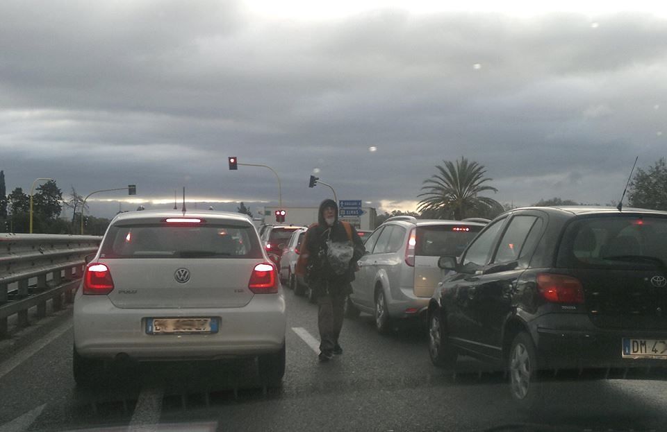 Giorgio Cocco, 62enne, cagliaritano, ma residente ad Assemini, padre di due figli (33 e 36 anni), da oltre sedici anni svolge un lavoro “atipico”: si guadagna da vivere vendendo i giornali al semaforo di Elmas, sulla statale 130. Lo si incontra tutti i giorni: come scatta il “rosso” va avanti e indietro tra le auto ferme, a vendere i giornali agli automobilisti di passaggio. Anche se in genere sono in pochi a comprargli il giornale. Mediamente ne vende circa 50 al giorno. Essendo da tempo disoccupato e non trovando un altro impiego, s’inventò un lavoro “atipico” dedicandosi a quest’attività di “giornalaio ambulante”. Ed è così che da diversi anni lo si incontra fin dalle prime ore del mattino con un carico di giornali sullo zaino, tra gli automobilisti di passaggio. Poi, a fine mattinata intorno alle 12,30 termina la sua attività. Ogni giorno macina chilometri e chilometri andando avanti e indietro, spesso a vuoto. Per proteggersi dai gas di scarico delle auto usa un’apposita mascherina e il gilet catarifrangente salvavita. Lavora 365 giorni all’anno e in 16 anni non ha fatto un giorno di malattia. Il suo guadagno? Circa 500 euro al mese. Durante la sua attività percorre circa 30 km al giorno. Un lavoro di sacrificio e usurante, tra le intemperie: pioggia, freddo e vento d’inverno e caldo d’estate. Paga regolarmente le tasse: ha sinora versato 41 anni di contributi. Sarebbe già in pensione se la Fornero non avesse modificato la legge. Ma a quanto pare dovrà lavorare altri cinque anni.