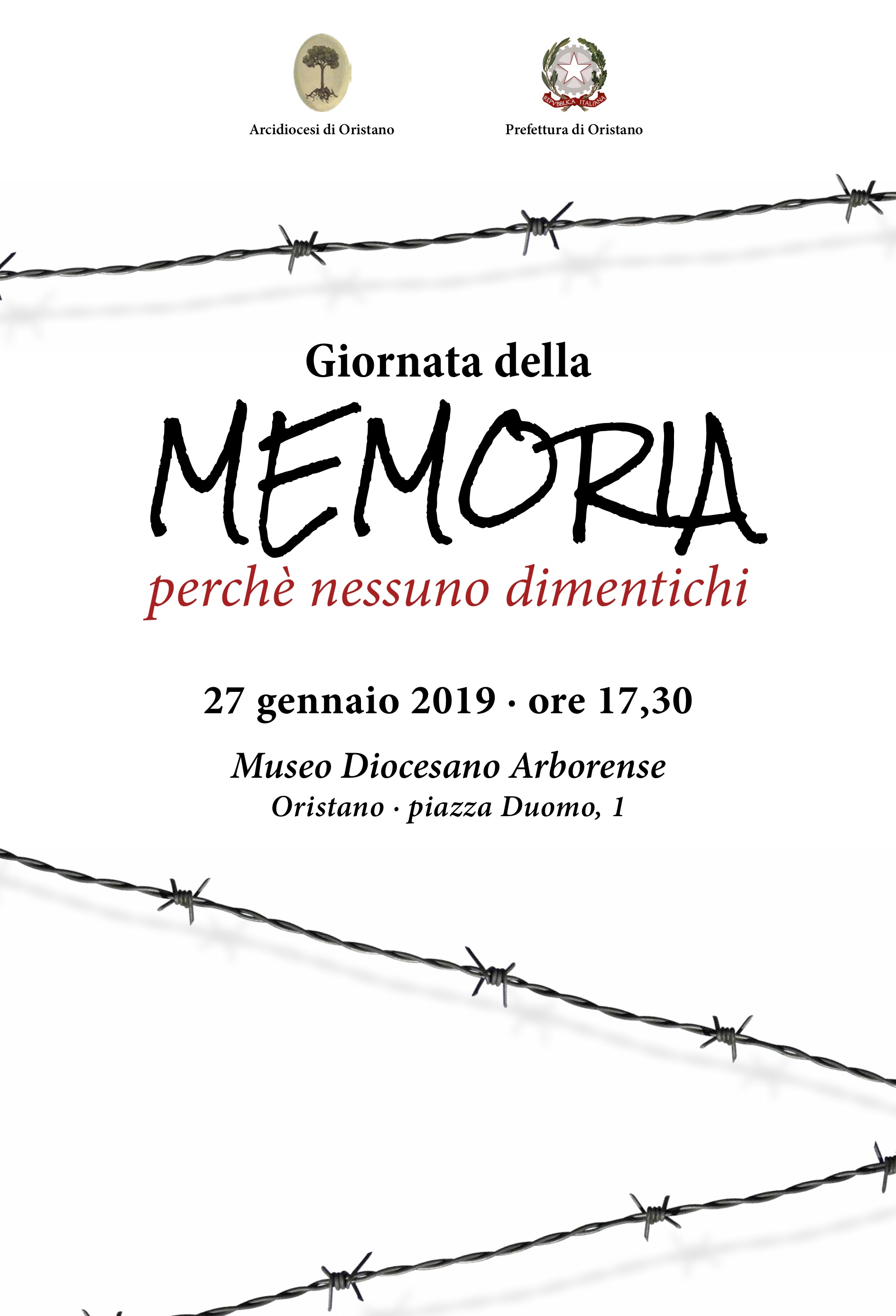 Domenica 27 gennaio 2019, alle 17.30, nei locali del Museo Diocesano Arborense, in piazza Duomo 1, ad Oristano, avrà luogo una serata di riflessione e commemorazione delle vittime dell’Olocausto e delle leggi razziali. L’evento, fortemente voluto dall’Arcidiocesi Arborense, è organizzato in collaborazione con la Prefettura di Oristano e sarà animato dagli studenti degli Istituti di Istruzione Superiore “S.A. De Castro” e “Mariano IV d’Arborea” di Oristano, con la partecipazione del Centro Servizi Culturali U.N.L.A e del violinista Giambattista Longu. Il fine di ricordare la Shoah, le leggi razziali, la persecuzione dei cittadini ebrei, gli italiani che hanno subito la deportazione, la prigionia, la morte, coloro che si sono opposti al progetto di sterminio offrendo protezione ai perseguitati e salvando vite, anche mettendo a rischio la propria, è quello di conservare la memoria di una pagina oscura della storia dell’umanità, affinché non ne sia mai più scritta una simile.