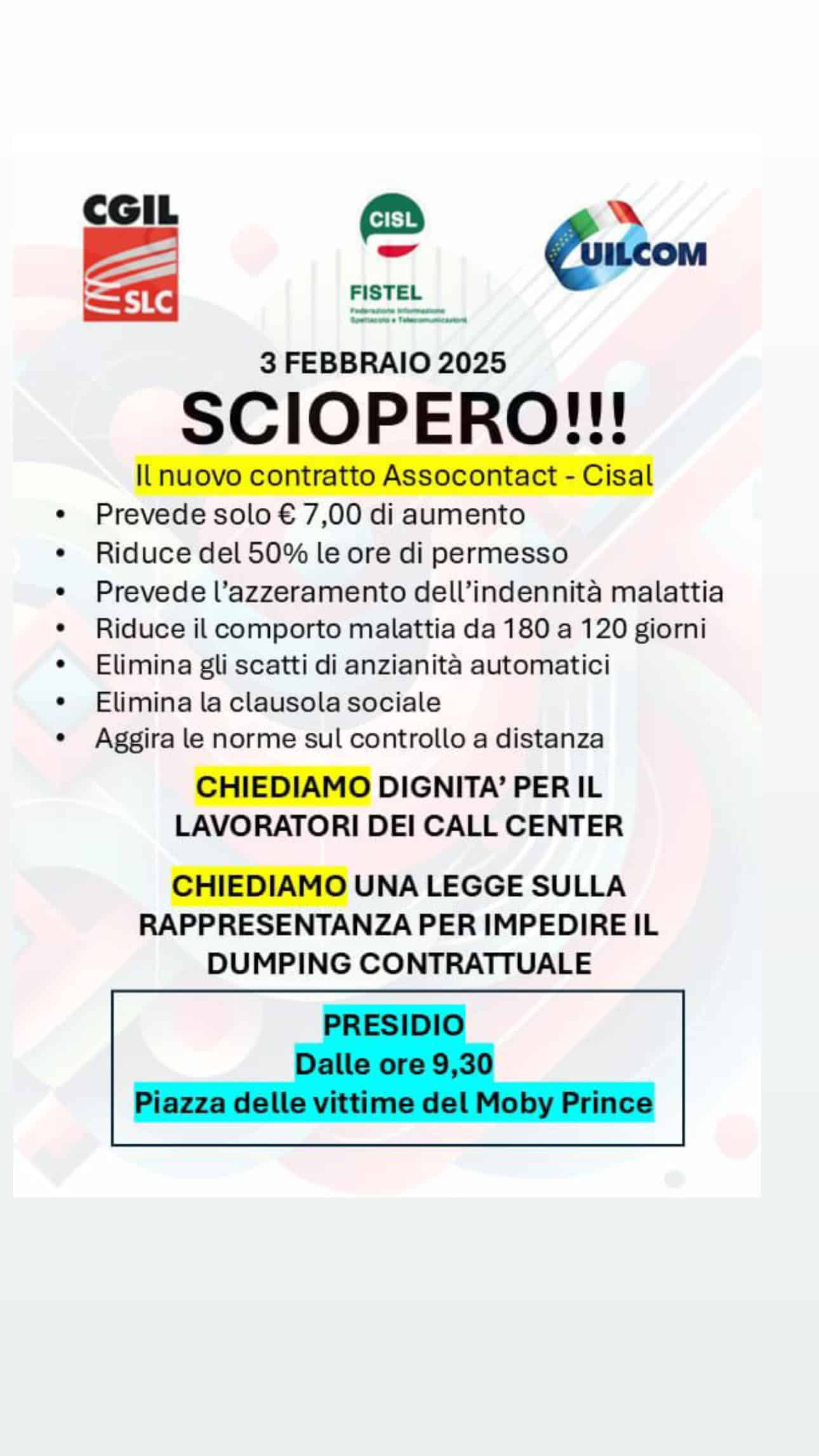 ELIMINERA’ tutte le tutele e le garanzie occupazionali previste dalla “clausola sociale”, come invece era previsto dal precedente CCNL delle TLC.. Chiediamo dignità per i lavoratori e le lavoratrici dei call center. Chiediamo una legge che impedisca il dumping contrattuale.