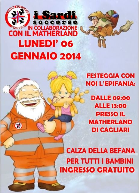 I Sardi Soccorso in collaborazione con Matherland organizzano per lunedì 6 gennaio, giorno dell’epifania, una festa per poter dare alle famiglie in difficoltà la possibilità di regalare una giornata di giochi e spiensieratezza ai propri bambini. Per l’occasione verrà offerta la tipica calza della befana e una merenda oltre naturalmente all’ingresso gratuito ai giochi di Matherland. Appuntamento quindi lunedì 6 dalle 9 alle 13.