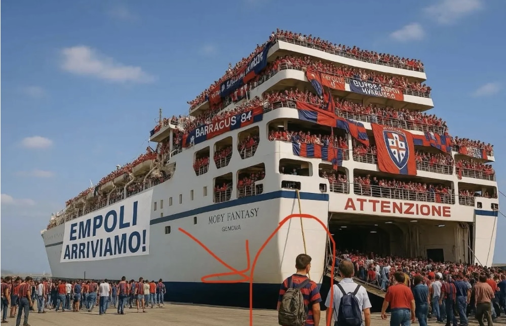 Dopo la clamorosa vittoria del ricorso al TAR del club rossoblù, c’è un tifoso d’eccezione che gioisce insieme a tutti gli altri: il figlio di Rombo di Tuono, Nicola Riva, che ha postato sui social una foto fatta con l’intelligenza artificiale in cui si accinge ad imbarcarsi verso Empoli per assistere al match di domenica so Castellani. “Empoli arriviamo!”, scrive Riva, cerchiandosi di rosso nella foto in cui si avvicina alla nave.