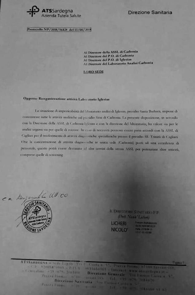 Nella nota del 13 agosto scritta con la complicità della Dott.ssa Giua e della Dott.ssa Garau, viene anche precisato che potranno essere presi accordi con Cagliari per il trasferimento di attività diagnostiche specialistiche.