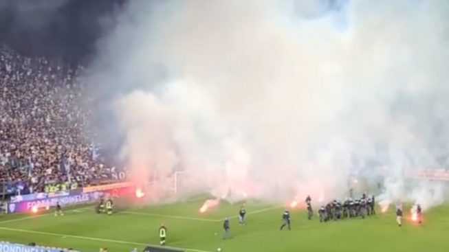 Il Brescia di Masino Cellino retrocede in serie C dopo 38 anni trascorsi tra la serie A e la B, e lo fa nel peggiore dei modi. La gara di ritorno dei playoff termina 1-1 e si salva il Cosenza, forte dell’1-0 dell’andata. E subito dopo il pareggio dei calabresi, ottenuto nei minuti finali, lo stadio Rigamonti si trasforma in una bolgia. Un gruppo nutrito di ultras invade il campo, dalla curva biancoazzurra piovono decine e decine di fumogeni. L’arbitro Massa è costretto a interrompere la partita quando si era già nei monti di recupero. Regna la paura, qualche giocatore scappa negli spogliatoi e arriva la polizia. Sugli spalti compaiono striscioni con la scritta “E adesso vattene”, nel mirino c’è proprio Cellino, l’ex presidente del Cagliari.