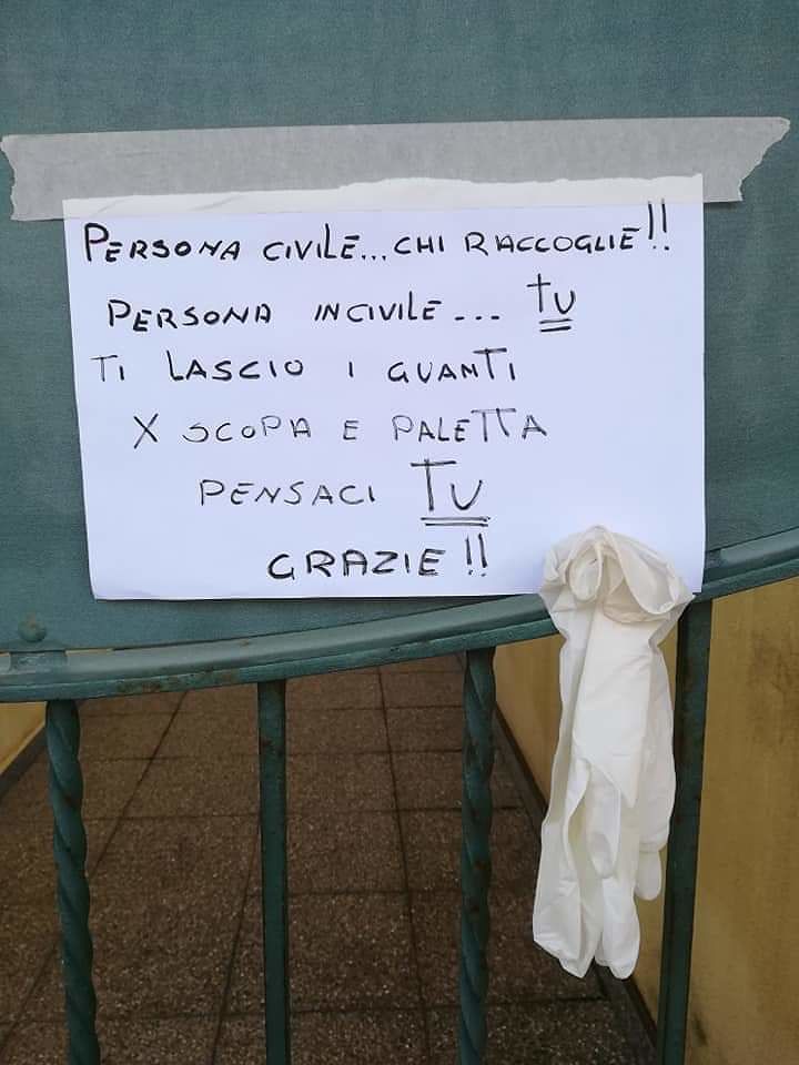 “Può capitare – spiega un residente – che una busta si rompa durante la notte e la spazzatura cada per strada. Le persone che abitano nel condominio dovrebbero riconoscere i propri rifiuti e raccoglierli subito. Invece, dopo alcuni giorni, tutto rimane ancora giacente sul marciapiede”. Un invito esplicito, quindi, quello che è stato scritto: “Persona civile chi raccoglie…. Persona incivile tu. Ti lascio i guanti. Per scopa e paletta pensaci tu”. Una sollecitazione, affinché il senso civico possa prevalere per una buona convivenza e per salvaguardare la tutela e il rispetto dell’ambiente. “Non è la prima volta che troviamo roba in terra, buste sbagliate; ci vuole educazione civica ancora, anche per la differenziata, ma prorpio a qualcuno non entra in testa”.