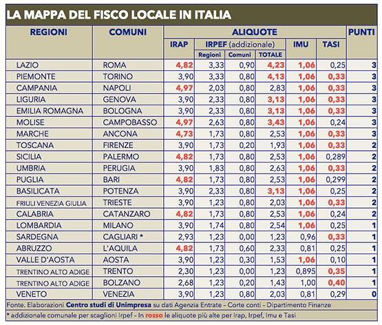 Cagliari tra le città più tassate d’Italia, secondo il centrodestra. Cagliari tra le città meno tassate d’Italia, secondo il centrosinistra. La doppia faccia della medaglia fiscale: oggi Fabrizio Marcello, presidente della commissione Servizi Tecnologici, diffonde una nuova tabella. E spiega: “Come vedete Cagliari risulta essere tra le città più basse sulla tassazione, la Mappa del fisco locale in Italia” realizzato dal Centro studi di Unimpresa su dati dell’Agenzia delle Entrate, della Corte dei conti e del Dipartimento Finanze. Prende in considerazione le aliquote Iperf (definite dalle Regioni), il totale delle addizionali Irpef (Regioni e Comuni), l’Imu e la Tasi”.