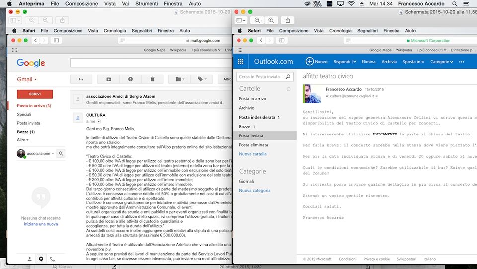 Passati due giorni, e non avendo ricevuto alcuna risposta, ho deciso di mandare una nuova mail, identica, questa volta dal mio indirizzo di posta personale. L’oggetto? Sempre lo stesso. Affitto del Teatro Civico di Castello per iniziative culturali.