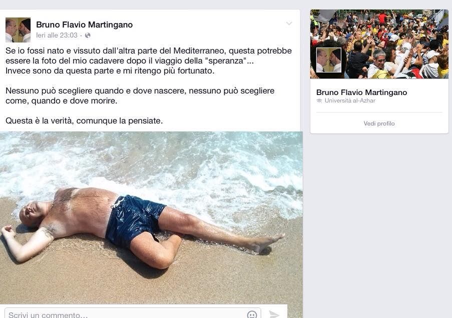 “Se io fossi nato e vissuto dall’altra parte del Mediterraneo, questa potrebbe essere la foto del mio cadavere dopo il viaggio della “speranza”… Invece sono da questa parte e mi ritengo più fortunato. Nessuno può scegliere quando e dove nascere, nessuno può scegliere come, quando e dove morire…Questa è la verità, comunque la pensiate”. Non lo ha scritto un salviniano ma Bruno Flavio Martingano, consigliere comunale di Quartucciu del Movimento 5 Stelle.