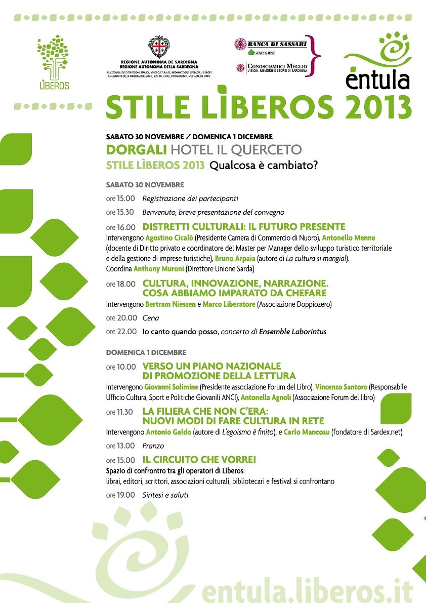 Il primo incontro si terrà sabato alle 16, quando sul tema “Distretti culturali: il futuro presente” interverranno Agostino Cicalò (presidente della Camera di Commercio di Nuoro), Antonello Menne (docente di Diritto privato e coordinatore del Master per manager dello sviluppo turistico territoriale e della gestione di imprese turistiche), Bruno Arpaia (autore di La cultura si mangia!) coordinati dal direttore dell’Unione Sarda Anthony Muroni. Alle 18 Bertram Niessen e Marco Liberatore (Associazione Doppiozero) interverranno su “Cultura, innovazione, narrazione. Cosa abbiamo imparato da Che Fare”. Alle 22, dopo la cena, concerto di Ensemble Laborintus. Domenica si comincerà alle 10 con l’incontro dal titolo “Verso un piano nazionale di promozione della lettura” al quale prenderanno parte Giovanni Solimine (presidente dell’associazione Forum del libro), Vincenzo Santoro (responsabile Ufficio cultura sport e politiche giovanili Anci), Antonella Agnoli (Forum del libro). Si proseguirà alle 11,30 con Antonio Galdo (autore di L’egoismo è finito) e Carlo Mancosu (fondatore di Sardex.net) che interverranno sul tema “La filiera che non c’era: nuovi modi di fare cultura in Rete”. La due giorni si concluderà al termine dell’incontro delle 15 “Il circuito che vorrei”, spazio di confronto tra gli operatori Lìberos.