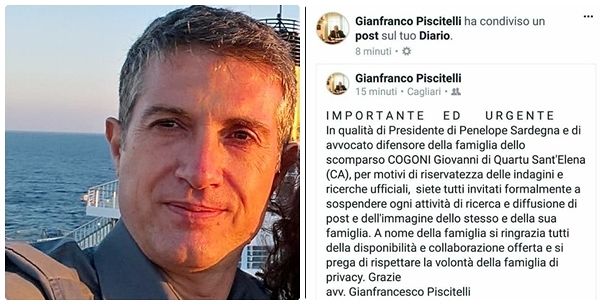 Allontanamento volontario all’estero. Dagli ambienti della Questura cagliaritana, non si esclude per ora anche questa pista: ma è ancora giallo e mistero sulla scomparsa da alcuni giorni del 52enne quartese, Giovanni Cogoni. Da un lato, il legale della famiglia, l’avvocato Gianfranco Piscitelli, ha chiesto ufficialmente lo “stop alle ricerche e alla diffusione di post sui social sul suo allontanamento”, per motivi di privacy nei confronti dei familiari, una sorta di silenzio insomma dopo il clamoroso sos lanciato su facebook sulla scomparsa.