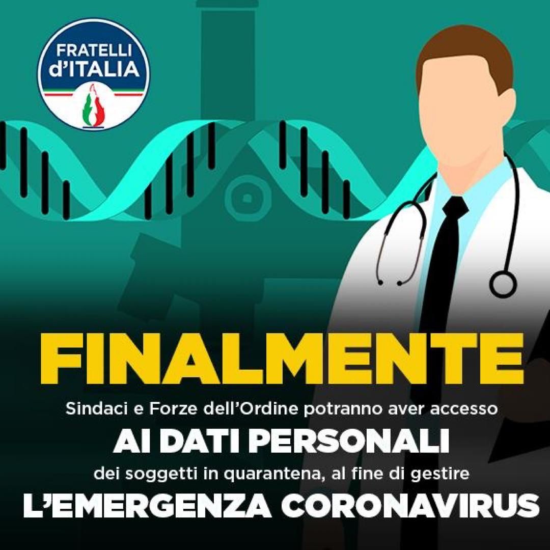 “Bene il Governo che risponde in maniera positiva alla nostra richiesta – segnalata tramite un’interrogazione – circa la necessità di far reperire anche alle Forze dell’Ordine e ai Sindaci – principalmente impegnati nella repressione delle violazioni – i dati specifici delle persone sottoposte alla misura di quarantena, causa coronavirus, al fine di agevolarne l’operazione di controllo”.