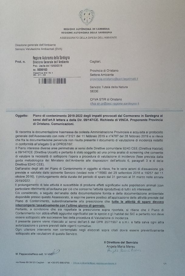 Infatti, il vigente piano di controllo del Cormorano 2019-2022, predisposto dalla Provincia di Oristano e approvato con decreto Ass.re Difesa Ambiente R.A.S. n. 18690/DecA/8 del 10 settembre 2019, è basato sul provvedimento favorevole al termine del procedimento di valutazione di incidenza ambientale (V.Inc.A.) emesso dal Servizio valutazioni ambientali dello stesso Assessorato (nota S.V.A. prot. n. 6163 del 15 marzo 2019) alla condizione che “tutte le attività di sparo devono interrompersi tassativamente con l’ultimo giorno di gennaio”, perché “il prolungamento di tale attività è suscettibile di produrre effetti significativi sulle popolazioni animali (con particolare riferimento all’avifauna per ciò che concerne l’attività riproduttiva) di tutti i siti interessati”.