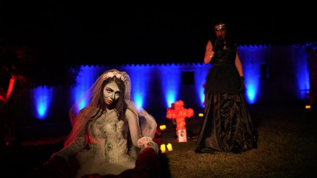 Tanta la curiosità attorno all’evento della vigilia di Ognissanti. Il dress code ha stimolato la creatività dei partecipanti, tutti con coroncine floreali e face tattoo, accolti all’ingresso da un luccicante carro funebre risalente agli anni ‘80 del secolo scorso, che ha aperto il corteo all’interno di un suggestivo cimitero, illuminato da spettacolari giochi di luci e seminascosto dalle ombre e dalla nebbia artificiale. Al centro del macabro e raffinato camposanto, tra le lapidi che ospitavano le foto dei professionisti che hanno collaborato all’organizzazione, una bara (del 1970) ospitava la fiabesca “sposa cadavere”, per l’occasione impersonata dalla miss sarda Serena Caredda, vincitrice del titolo nazionale “Ragazza per il cinema” 2022.