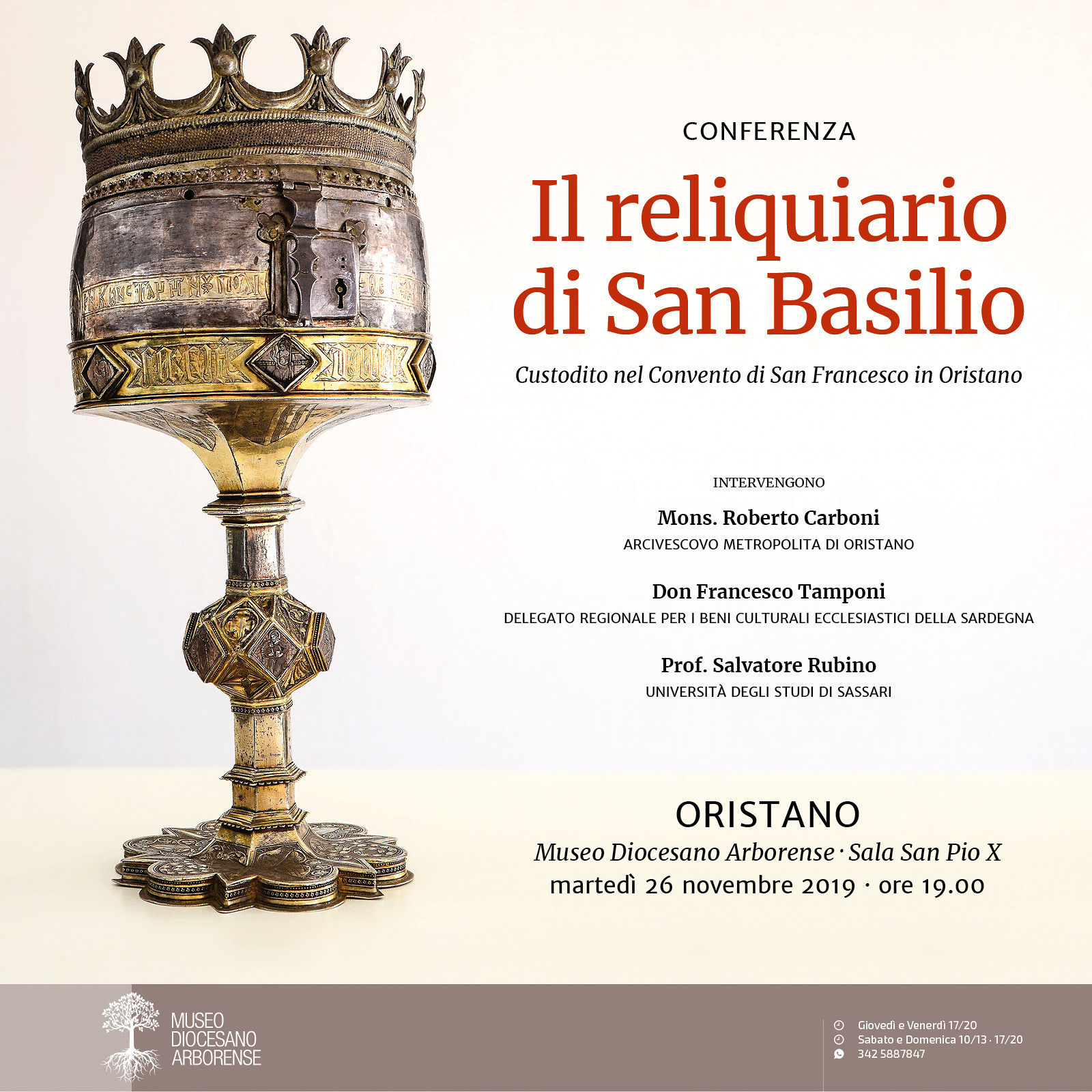 Il prezioso Reliquiario di San Basilio, conservato nel convento di San Francesco in Oristano, sarà il tema della conferenza che si terrà martedì 26 novembre p.v. alle ore 19.00, al Museo Diocesano Arborense, nella Sala San Pio X, con gli interventi di Mons. Roberto Carboni, Arcivescovo Metropolita di Oristano, Don Francesco Tamponi, delegato regionale per i Beni Culturali Ecclesiastici della Sardegna e il professore Salvatore Rubino, dell’Università degli Studi di Sassari.