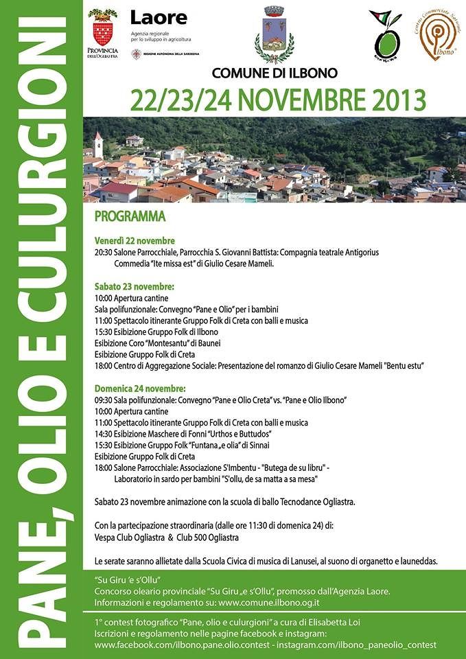 Come di consueto, l’ultimo fine settimana di novembre, il Comune di Ilbono, organizza la manifestazione “Pane, Olio e Culurgioni” giunta alla 14° edizione.