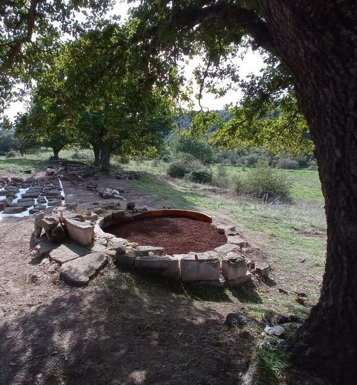 Nel corso delle indagini precedenti sono emerse diverse strutture, che all’inizio dei lavori non erano più ben visibili ma che sono ora tornate alla luce dopo un’accurata pulizia. Tra queste vi è una struttura circolare realizzata con una raffinatissima tecnica di costruzione in conci di trachite e basalto fissati tra loro da perni in piombo: si tratta di una rotonda, un tipo di costruzione sacra meno nota e meno diffusa rispetto ai pozzi sacri, di cui si conservano pochi esempi sparsi nell’Isola e tutti in precario stato di conservazione. Nel corso del cantiere si è provveduto al restauro della struttura circolare e all’allargamento dell’area di scavo, per comprendere al meglio tutti gli elementi residui del santuario.
