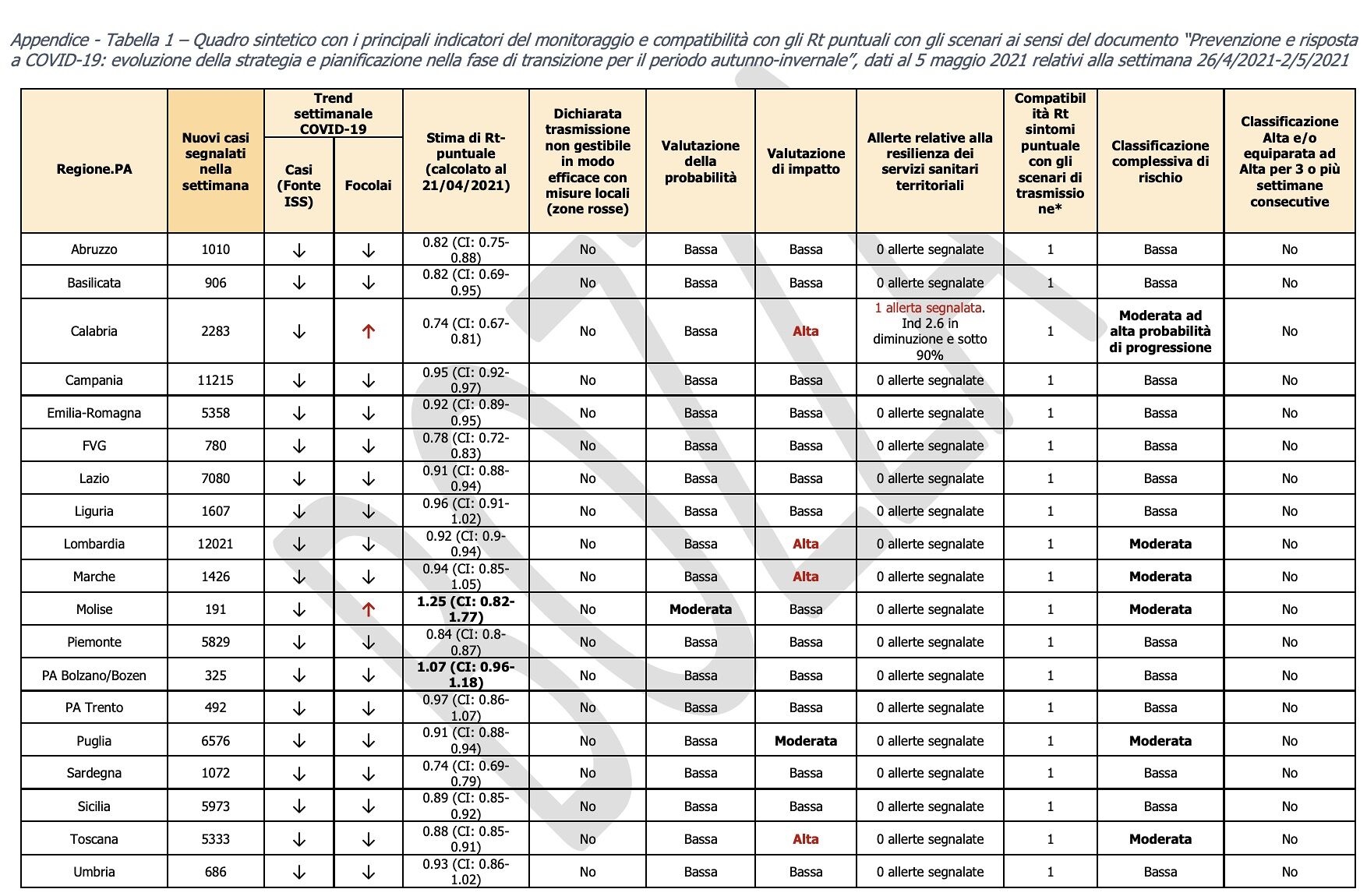 L’indice Rt della Sardegna è il più basso d’Italia: 0,74, come l’Isola c’è solo la Calabria. Nuovi casi (1072) e focolai in calo, una valutazione di impatto bassa, nessuna allerta segnalata nei servizi sanitari territoriali e una classificazione complessiva di rischio giudicata bassa, stando all’ultimo monitoraggio dell’Istituto superiore di sanità, che fa riferimento alla settimana dal 26 aprile al due maggio 2021. Tutti dati che certificano una situazione da piena zona gialla, per capirci. Il colore che, questa è la speranza di tutti, possa essere assegnato sin dal prossimo lunedì dieci maggio. La Sardegna, ancora, rispetto alla media nazionale di 0,89, ha addirittura un Rt più basso. La decisione finale spetta al ministro della Salute Roberto Speranza: Sardegna già gialla tra poco meno di settantadue ore o un’altra settimana in arancione? I dati parlano chiaro, ma per il passaggio di fascia bisogna attendere quattordici giorni. E la partita della Valle D’Aosta (in zona rossa da lunedì scorso ma che potrebbe passare in arancione da lunedì prossimo) sembra essere ancora aperta. Sono ore decisive, soprattutto per i tanti baristi e ristoratori sardi: con l’arancione confermato potranno continuare a lavorare solo, in modalità ridotta, con l’asporto o il domicilio. In caso di giallo, invece, potranno riaprire a pranzo, ma solo chi ha posti all’aperto. Ecco, di seguito, la tabella-bozza con tutti i dati.