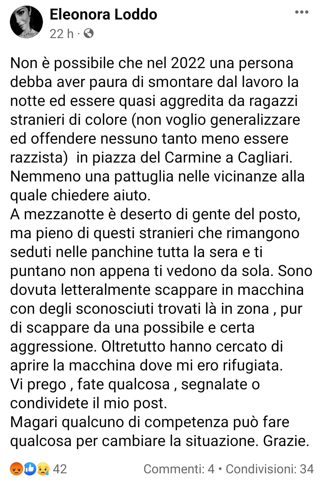 Una tentata aggressione, sfumata solo per la rapidità di riflessi, nonostante la paura, di una ragazza che lavora in piazza del Carmine a Cagliari, Eleonora Loddo. È lei ad aver raccontato, pubblicamente, cosa le è capitato ieri notte nella piazza che è, ancora e purtroppo, l’ex salotto buono della città: “Non è possibile che nel 2022 una persona debba aver paura di smontare dal lavoro la notte ed essere quasi aggredita da ragazzi stranieri, non voglio generalizzare ed offendere nessuno, tanto meno essere razzista”, scrive la giovane. Che si è sentita sola e non tutelata: “Non c’era nemmeno una pattuglia nelle vicinanze alla quale chiedere aiuto. A mezzanotte è deserto, ma pieno di questi stranieri che rimangono seduti nelle panchine tutta la sera e ti puntano non appena ti vedono da sola. Sono dovuta letteralmente scappare in macchina con degli sconosciuti trovati là in zona , pur di scappare da una possibile e certa aggressione”.