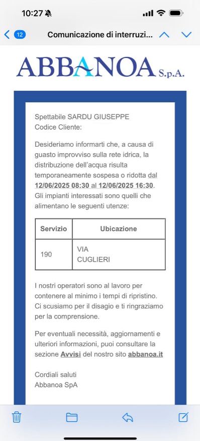 Abbanoa ha avviato un nuovo servizio per avvisare via mail, pec o sms i propri clienti interessati da eventuali sospensioni del servizio idrico. Gli avvisi riguardano le interruzioni sia per lavori programmati sia per guasti improvvisi: nel primo caso le comunicazioni partono almeno 48 ore prima mentre nel secondo caso vengono inviate in tempo reale. Ogni cliente interessato riceve informazioni sul tipo di lavoro in corso o guasto che comporta un’interruzione, la zona interessata e sulle tempistiche di risoluzione del problema.