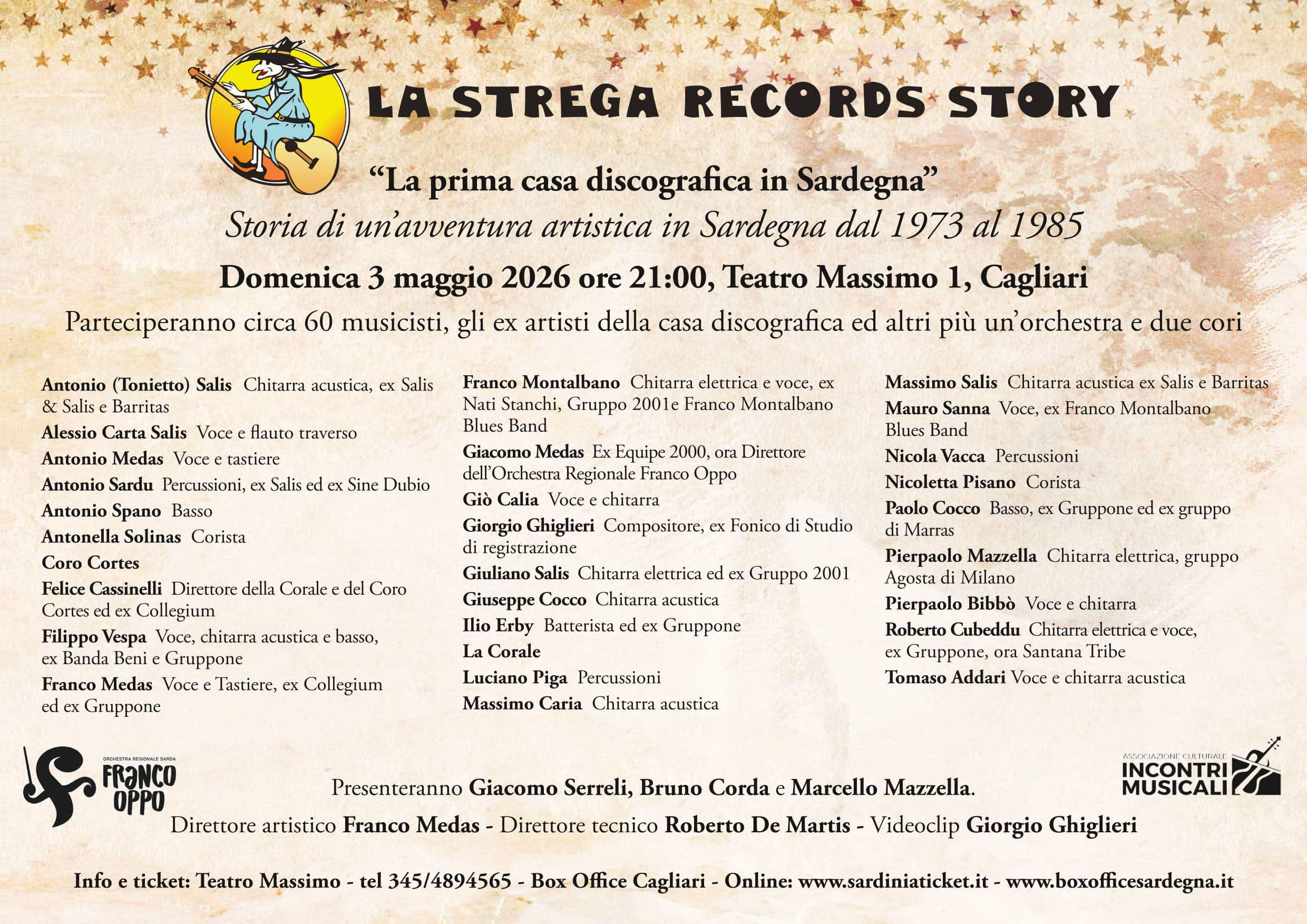 Certo, e con tanta voglia di farlo! Suoneranno con noi anche alcuni dei nostri figli e nipoti. Presenterà Giacomo Serreli, il giornalista più preparato sulla musica in Sardegna, che ha pubblicato una collana unica e formidabile. Con lui sul palco ci saranno anche Bruno Corda, noto giornalista sportivo ma anche musicista, e io, che dovrò “raccontare”. Verranno ricordati, in un filmato, anche artisti importanti de La Strega che purtroppo non ci sono più. È stato un dispiacere non poter accontentare tutti quelli che volevano partecipare, perché alla fine il tempo non sarebbe bastato. Altri non potranno essere presenti per diversi motivi. Vi aspettiamo numerosi!