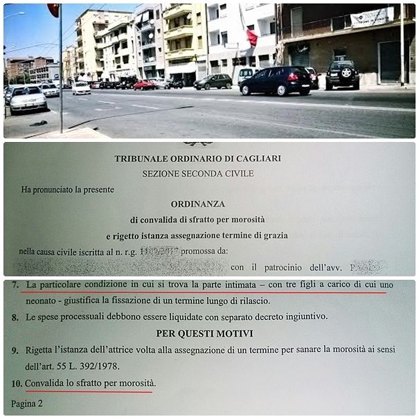 IL TRIBUNALE. Lettera di convalida di sfratto, del Tribunale ordinario di Cagliari, che sul tavolo decreta una pesante mannaia: “Dopo anni di lavoro esattamente undici ora sono disoccupata – dice Francesca, dal quartiere popolare di Is Mirrionis – mi ritrovo con quattro figli e per via dell’INPS che mi ha bloccato la disoccupazione mi ritrovo anche con uno sfratto e di conseguenza in mezzo a una strada. Ho chiesto aiuto ai servizi sociali che a loro volta mi hanno mandato in via Nazario Sauro con la lettera di sfratto per farmi inserire in graduatoria, nel frattempo sono andata da don Marco Lai alla chiesa di S. Eulalia chiedendo un aiuto almeno per un posto di lavoro, ma niente mi ha liquidata dicendomi che dovevo andare alla Caritas mentre da persone che lui segue ho saputo che lui stesso ne è il responsabile. Presentandomi nuovamente all’ufficio comunale di via Nazario Sauro mi è stato detto che la mia domanda non può essere accolta perché ad oggi domande per case popolari o a parcheggio non ce ne sono. Bloccata disoccupazione bonus bebè domande varie comprese inclusione attiva e contrasto di estrema povertà, una mamma di famiglia come può comportarsi?