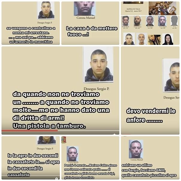 Sono soltanto alcuni frammenti audio di altrettante intercettazioni durate ore intere che i poliziotti hanno acquisito, perchè da settimane infatti pedinavano i componenti della banda delle rapine in ville e abitazioni del cagliaritano. A bordo, sicuramente di auto, con la musica latin-raggaetton a palla, si scambiavano le informazioni su come nascondere le armi, aprire le casseforti, su nuove pistole di cui impossessarsi e compiere reati: ricezioni di conversazioni telefoniche insomma su cui c’era ben altro che una semplice chiacchierata tra amici, famigerati delinquenti che progettavano quale colpo mettere a segno per rubare di tutto, oggetti preziosi, oro, soprattutto metallo prezioso da “squagliare”.