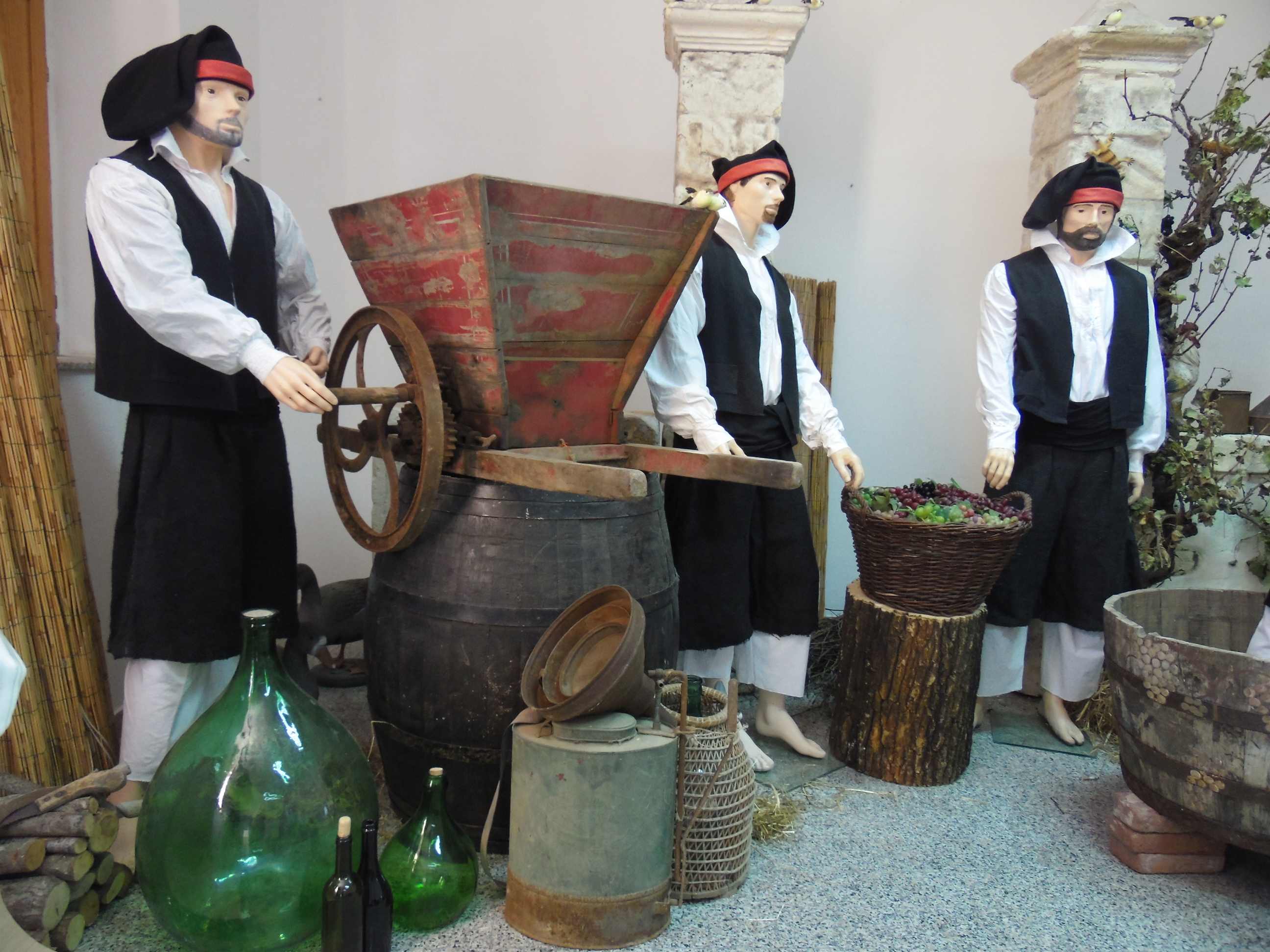 Le giornate della vendemmia erano le più attese dagli abitanti di Paringianu: era il momento di tirare le somme di un’intera annata di lavoro e di fatiche non sempre giustamente ripagate a causa di cattivo tempo o del perdurare della siccità. Il vigneto nella famiglia ha occupato sempre un posto di rilievo. Esso veniva seguito nell’arco di tutte le stagioni con i lavori di potatura, legatura e piegatura dei tralci, zappatura del terreno e, infine, della protezione dell’uva dai predatori naturali come gli uccelli. Sulle strade ad ogni ora del giorno passavano carri e carretti trainati da buoi, trattori e in seguito i motocarri con sopra tutto l’occorrente per la vendemmia… Alle prime luci dell’alba ogni gruppo famigliare si avviava alla vigna per iniziare il lavoro, arrivatisi procedeva subito a scaricare dai trattori tutti gli attrezzi e i cesti che venivano collocati all’inizio di ogni filare, pronti per essere riempiti di grappoli. A questo punto si poteva procedere alla vendemmia. In una bella giornata di sole tutta la famiglia arrivava sul carro dei buoi con le scale, i cesti e le cesoie. E …via a raccogliere i preziosi chicchi! La vendemmia veniva fatta in allegria: era usanza delle donne intonare canti antichi tramandati dalle donne più anziane; erano giornate intense e faticose, e nessuno avvertiva la stanchezza, scacciata dalle melodie che trapelavano dai filari : erano canti “is contus” di gioia tra persone felici, innamorate della loro terra e del loro lavoro. Questa descrizione è un’intercalare di scene nell’itinerario della mostra con attrezzi e strumenti della vendemmia, di fotografie di storiche e di abiti centenari custoditi dagli abitanti di Paringianu esposti nel percorso della mostra.