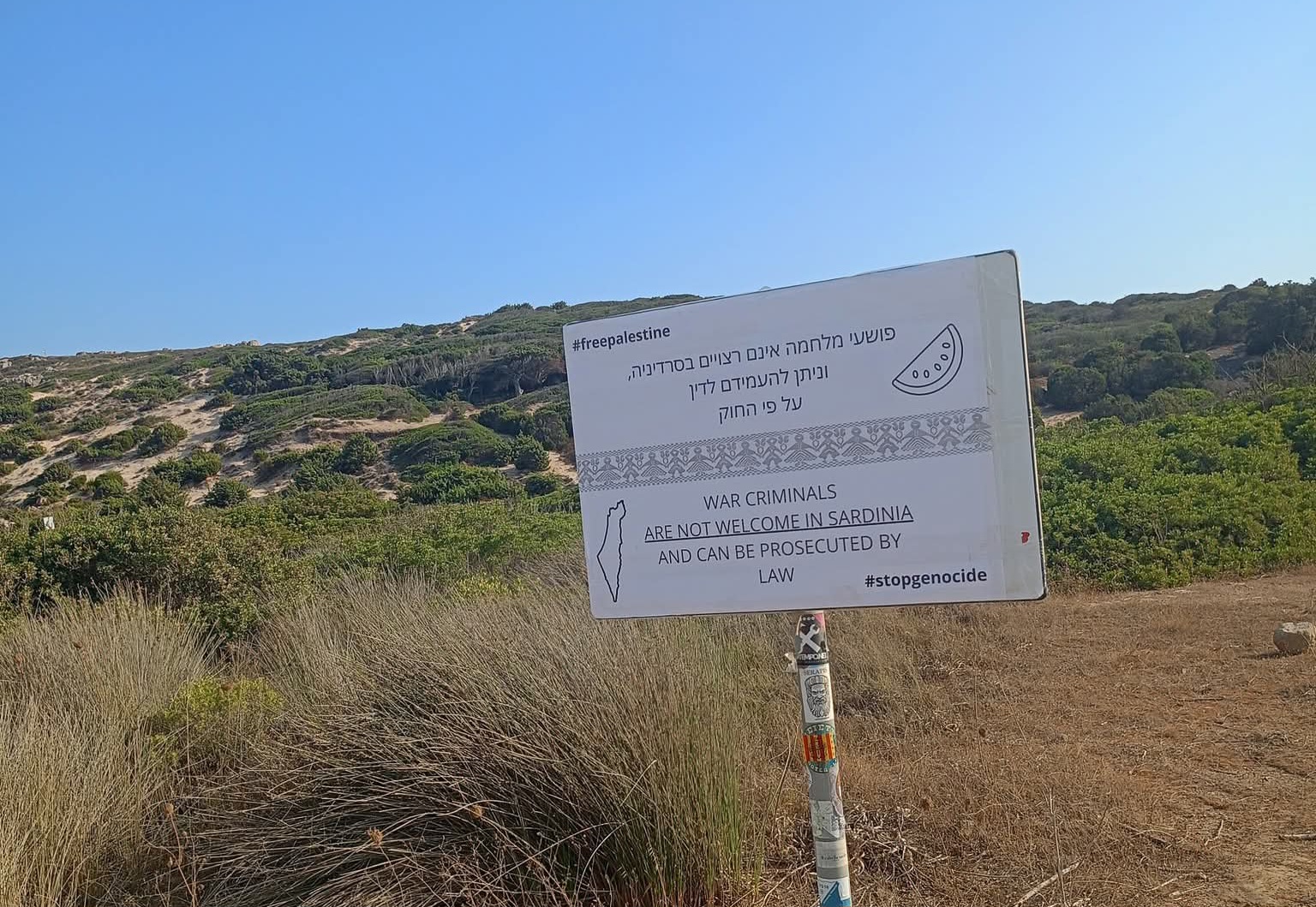Presa di posizione contro il manifesto affisso prima della spiaggia e che recita: “I criminali di guerra non sono benvenuti in Sardegna e possono essere perseguiti dalla legge”, scritto bilingue, in ebraico e in inglese, “perché è proprio ai criminali di guerra che vorrebbe rivolgersi” ha spiegato Luisi Caria.