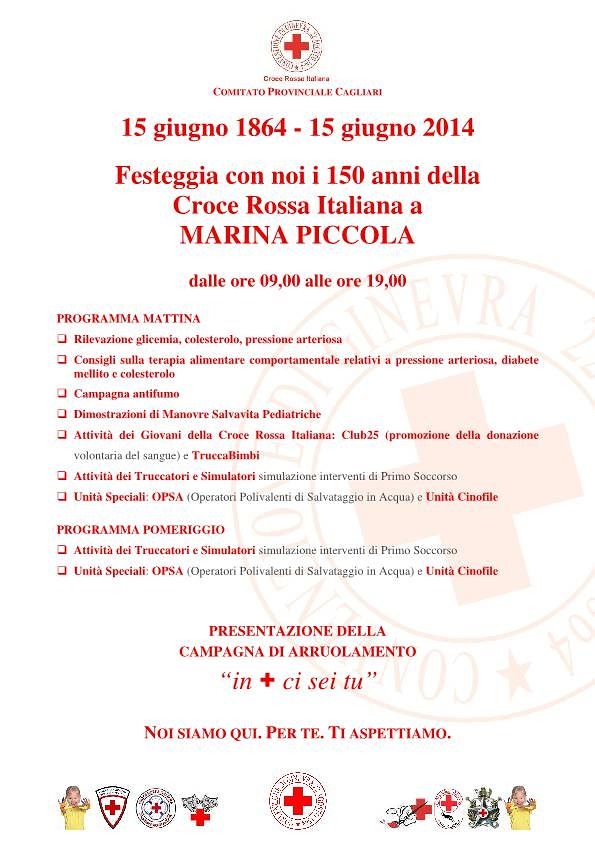 Centocinquanta anni di vita per la Croce Rossa Italiana, che festeggia il suo compleanno a Cagliari. L’appuntamento è per tutta la giornata di domenica 15 giugno 2014 a Marina Piccola, dalle 9 alle 1. I festeggiamenti, aperti a tutta la popolazione, sono stati organizzati dal Comitato Provinciale di Cagliari della Croce Rossa Italiana.