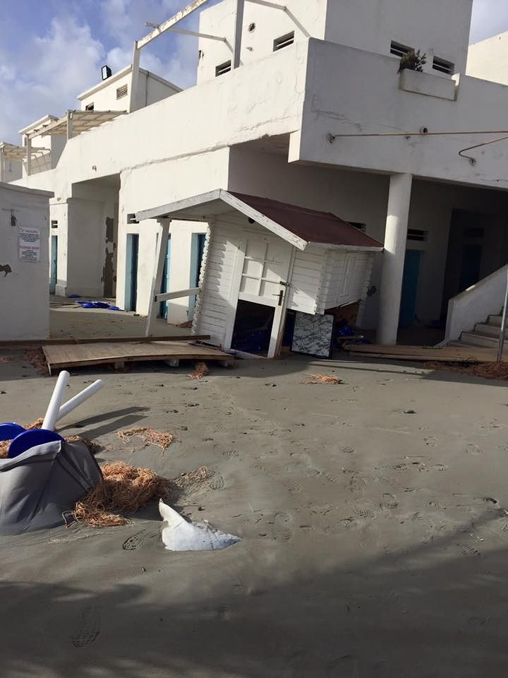 Scene da un litorale devastato dal maltempo. Mentre la forza della mareggiata lentamente comincia a ritirarsi, è la domenica della conta dei danni. Nella foto scattata da due nostri affezionati lettori, Sandro e Mariano, lo stabilimento balneare sembra quasi “bombardato” dal maltempo.