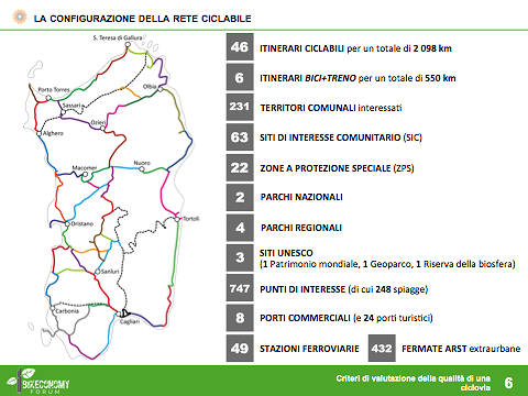 I primi passi. Nel Piano sono individuati gli itinerari della rete ciclistica regionale. Tra questi, 52 itinerari per una lunghezza totale di 2.649 km (di cui 550 km bici più treno); 256 centri abitati attraversati; 231 territori comunali attraversati; 63 Sic, 22 Zps, due parchi nazionali e quattro regionali in prossimità della Rete; tre siti Unesco (un sito patrimonio mondiale, un geoparco e una riserva della biosfera). Ma non solo. In prossimità della Rete sono presenti 747 punti di interesse (di cui 248 spiagge), tre borghi di eccellenza, otto porti commerciali (24 porti turistici); 49 stazioni ferroviarie e 432 fermate Arst extraurbane.