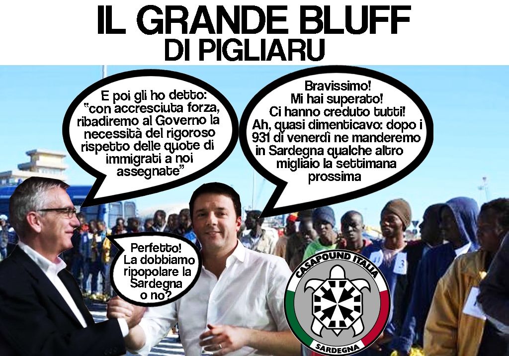 Questa la descrizione allegata alla vignetta che prende nuovamente di mira il presidente della RAS reo, secondo CasaPound, di essere “scomparso in un silenzio stampa imbarazzante” dopo l’ ultimo sbarco di migranti in Sardegna: “il monito che Pigliaru aveva rivolto al Governo per far rispettare le quote di assegnazione di immigrati alla Sardegna si è rivelato solo una dichiarazione di facciata, visto che nemmeno 48 ore dopo ne sono sbarcati altri 931 a Cagliari” – continua – “un bluff per placare gli animi dei sardi stufi di un’accoglienza non condivisa”.