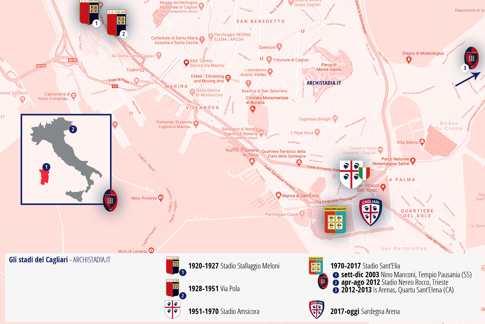 Potete vedere maggiori dettagli e anche la mappa dettagliata su Arkistadia.it a questo link: https://archistadia.it/cagliari-mappa-stadi-100-anni-di-storia/
