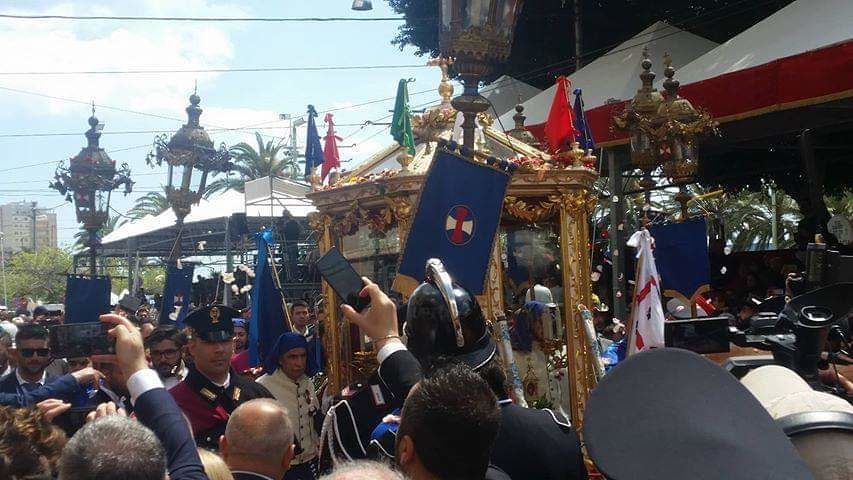 Non spacca il minuto, ma non c’è nessun problema. Sant’Efisio arriva in via Roma alle 13:40, accolto dalle sirene delle navi ferme in porto e da una “ramadura” mozzafiato. Migliaia di petali di rosa roicoprono colorano la strada, e il cocchio arriva come sempre scortato dai miliziani e dall’Alter Nos Raffaella Lostia, perfetta nel suo ruolo e per nulla emozionata nonostante si tratti della prima volta di una donna affianco al martire guerriero. Tripudio di flash delle macchine fotografiche, tanti lanciano petali ma anche bigliettini, contenenti preghiere, quando viene aperta la teca di vetro che protegge Efisio. Il cammino del santo più amato da tutta l’Isola è solo agli inizi.