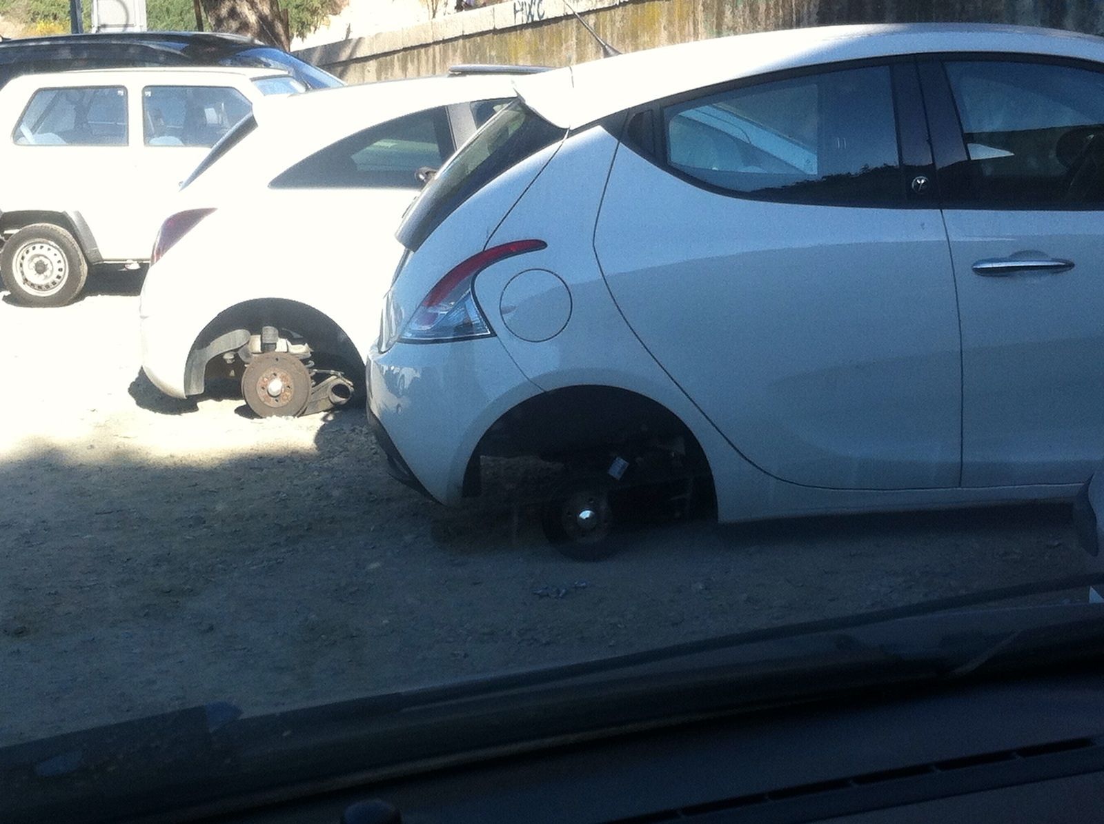 Ladri di ruote in azione in via Porcell. Come vedete nella foto inviata da un nostro lettore, ieri 27 dicembre a due autovetture parcheggiate nello sterrato sono state asportate interamente le ruote posteriori. “Una situazione che si verifica quasi ogni giorno. Pensare che a poca distanza sono localizzate le telecamere della ZTL: basterebbe poco per individuare i responsabili”.