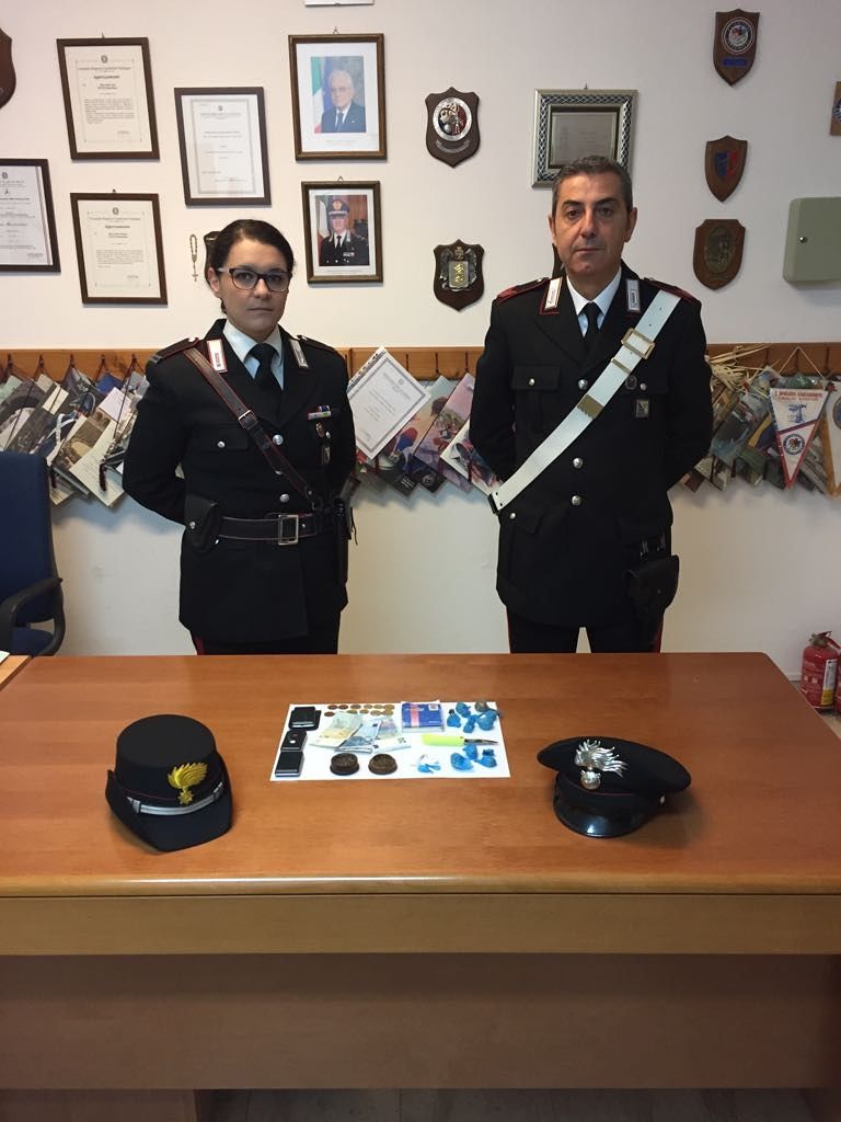San Giovanni Suergiu, frazione Matzaccara, ieri sera i carabinieridella stazione locale hanno sorpreso un 21enne, Mattia Selis, in compagnia di altri ragazzi. Ma, alla vista dei militari, il giovane si è disfatto del marsupio, lanciandolo. Prontamente recuperato dai militari, la scoperta al suo interno: diversi involucri in cellophane nei quali era conservata sostanza stupefacente fra cui 9,56 grammi di marijuana, 9,46 di hashish e 1,55 di cocaina. Nonchè un coltello la cui lama presentava tracce di sostanza stupefacente, un bilancino elettronico e la somma di € 49,00, provento dello spaccio, ed il libro mastro degli acquirenti.