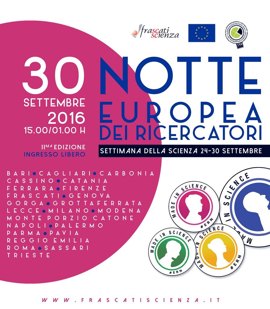 Nata nel 2005, la Notte europea dei Ricercatori quest’anno si svolge contemporaneamente il 30 settembre 2016 in circa 300 città in tutta Europa. Tutti gli eventi sono cofinanziati nel quadro delle azioni Marie Sklodowska-Curie del programma Horizon 2020. In Italia oltre al progetto coordinato da Frascati Scienza sono cinque i progetti vincitori del finanziamento europeo: Sharper, Luna 2016, Closer, Bright e Society.