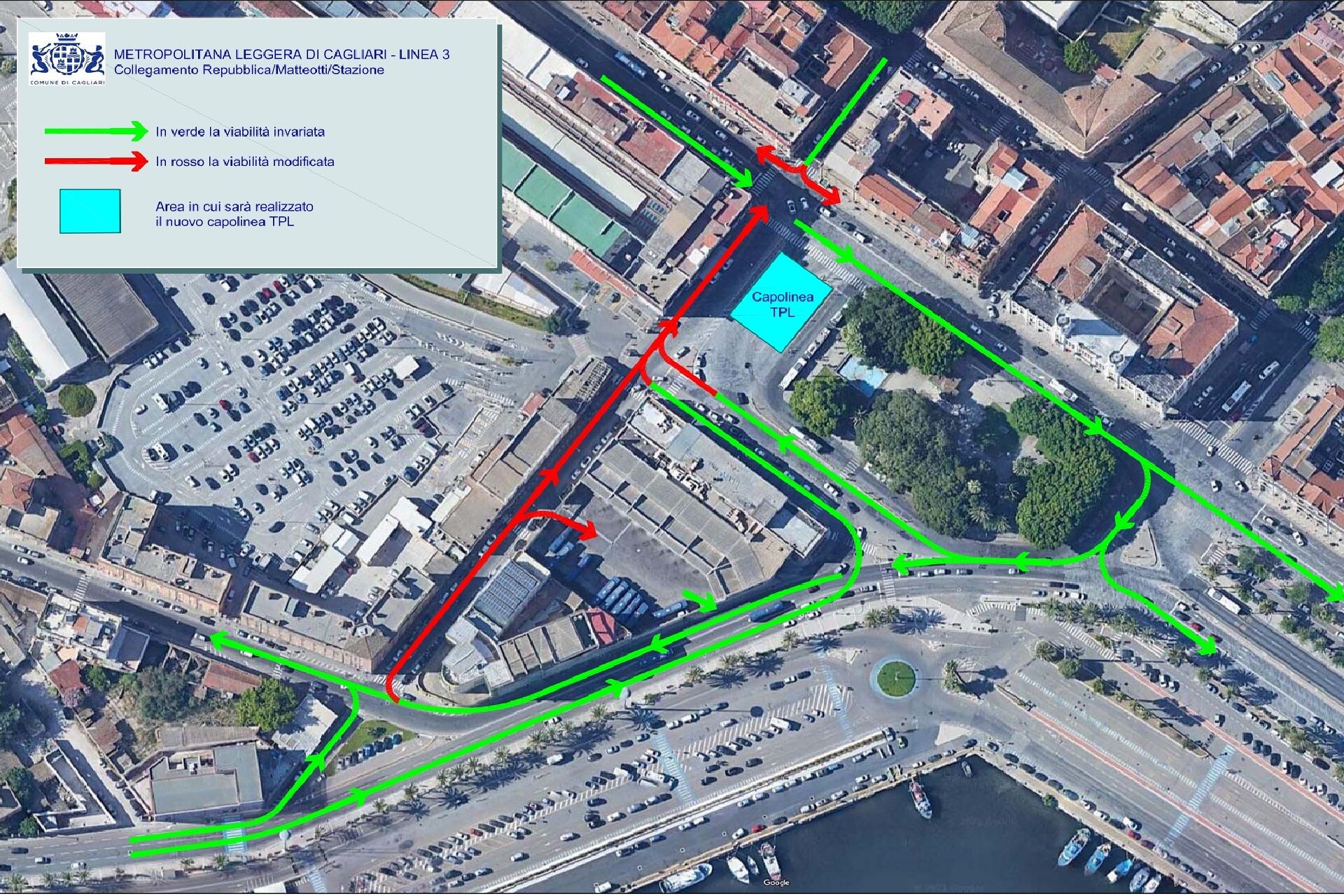 - piazza Matteotti: l’area compresa tra la piazza e lo spartitraffico fronte Stazione, sarà destinata alla realizzazione del nuovo capolinea TPL. Il traffico proveniente dalla via Molo Sant’Agostino potrà raggiungere la via Roma percorrendo la via Sassari.