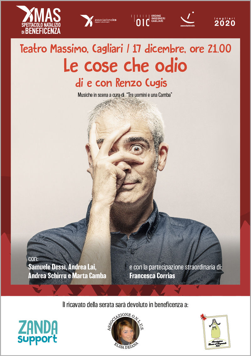Le cose che Odio è il titolo dello spettacolo che andrà in scena domani, martedì 17 dicembre al Teatro Massimo di Cagliari alle ore 21, protagonista Renzo Cugis, musiche in scena a cura di “Tre uomini e una Camba” con Samuele Dessì, Andrea Lai, Andrea Schirru e Marta Camba e con la partecipazione di Francesca Corrias.