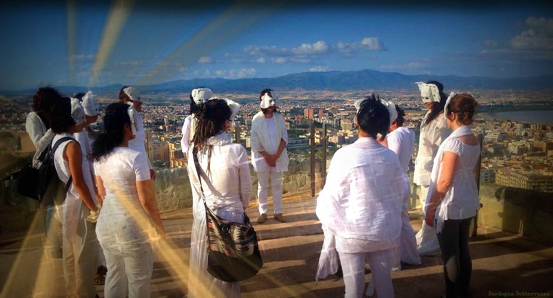 Vestite di bianco danzano in cerchio intonando canti d’altri tempi. Di quelli che le nostre trisavole intonavano nel tepore del fuoco o, si racconta ancor più indietro nel tempo, nei circoli megalitici. All’improvviso, dopo istanti di profondo silenzio, alcune di esse aprono le braccia sul tetto di Cagliari, dall’altissimo piano superiore dellaTorre dell’Efefante, ed è come se volessero spiccare il volo, come se volessero scrollarsi di dosso, con una invisibile ascensione, qualcosa che ci blocca o che ci limita… per far risorgere il nostro “Io”. Sono una decina di donne felici. Alcune indossano maschere bianche auto-prodotte ed i loro occhi, i loro sorrisi, una volta posata la maschera, ci trasmettono pienamente l’emozione appena vissuta, rendendo le teatranti coinvolgenti, contagiose di positività nel teatro come nella vita reale. Lo sanno bene le ragazze di Matrilineare, percorso teatrale made in Sardegna che ben presto potrebbe toccare nuove tappe oltre i confini isolani.