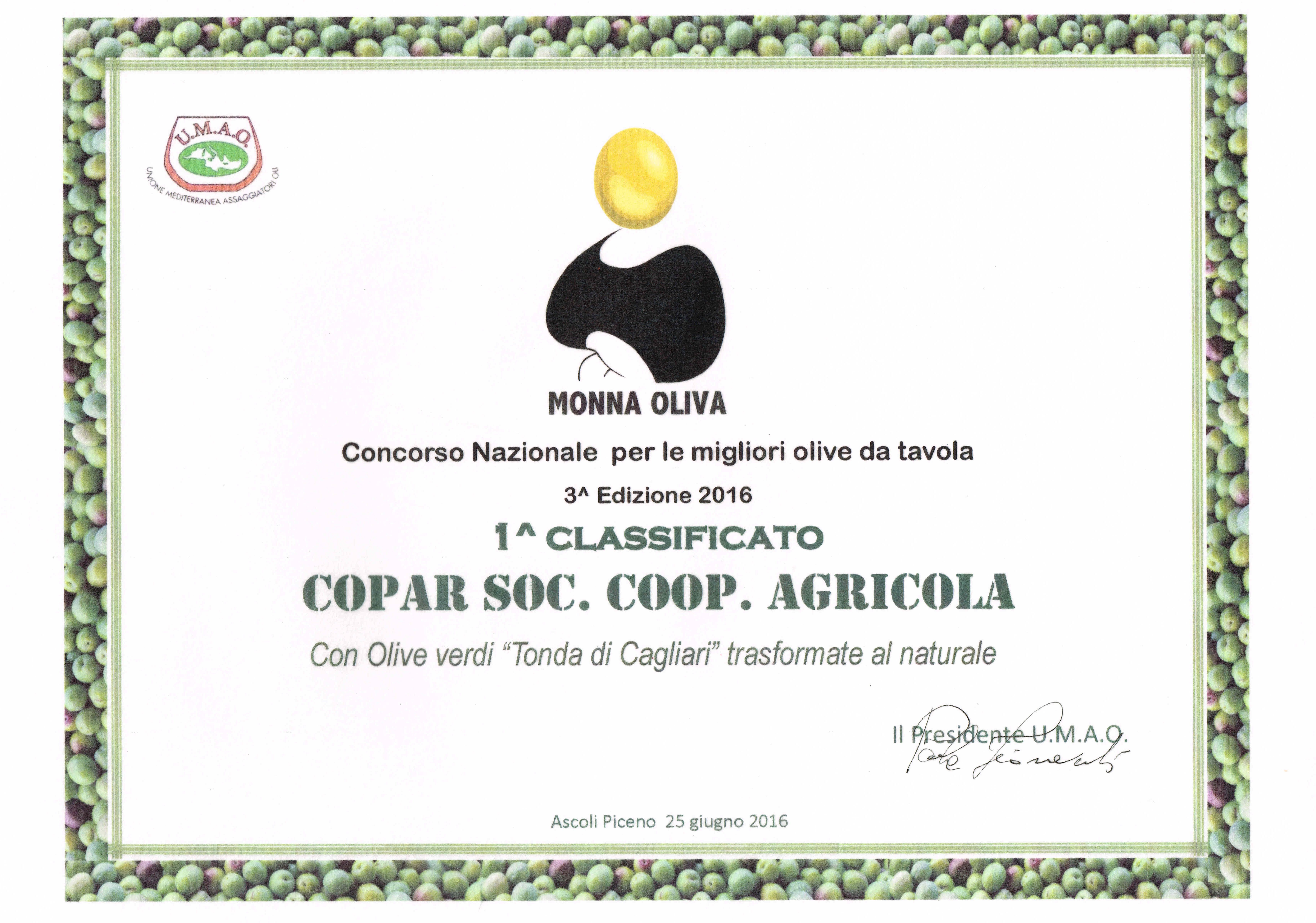 I giudici dell’UMAO (Unione Mediterranea Assaggiatori Olio) hanno confrontato e testato le olive dei territori Italiani più accreditati ( Sicilia, Puglia, Lazio, Abruzzo Campania ecc.). Il giudizio dopo le analisi sensoriali è stato unanime nello stabilire e certificare che le olive al Naturale più buone d’Italia sono della Cooperativa COPAR di Dolianova.
