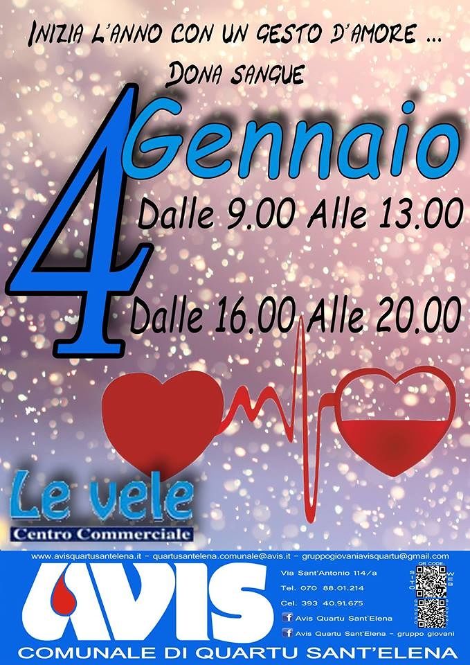 “Inizia l’anno con un gesto d’amore”. Sabato 4 gennaio l’Avis sarà presente con un’autoemoteca presso il centro commerciale Le Vele a Quartucciu, dalle 9 alle 13 e dalle 16 alle 20. Il sangue è l’unico farmaco che salva le vite che non si può prendere in farmacia, ma solo attraverso il gesto d’amore della donazione.