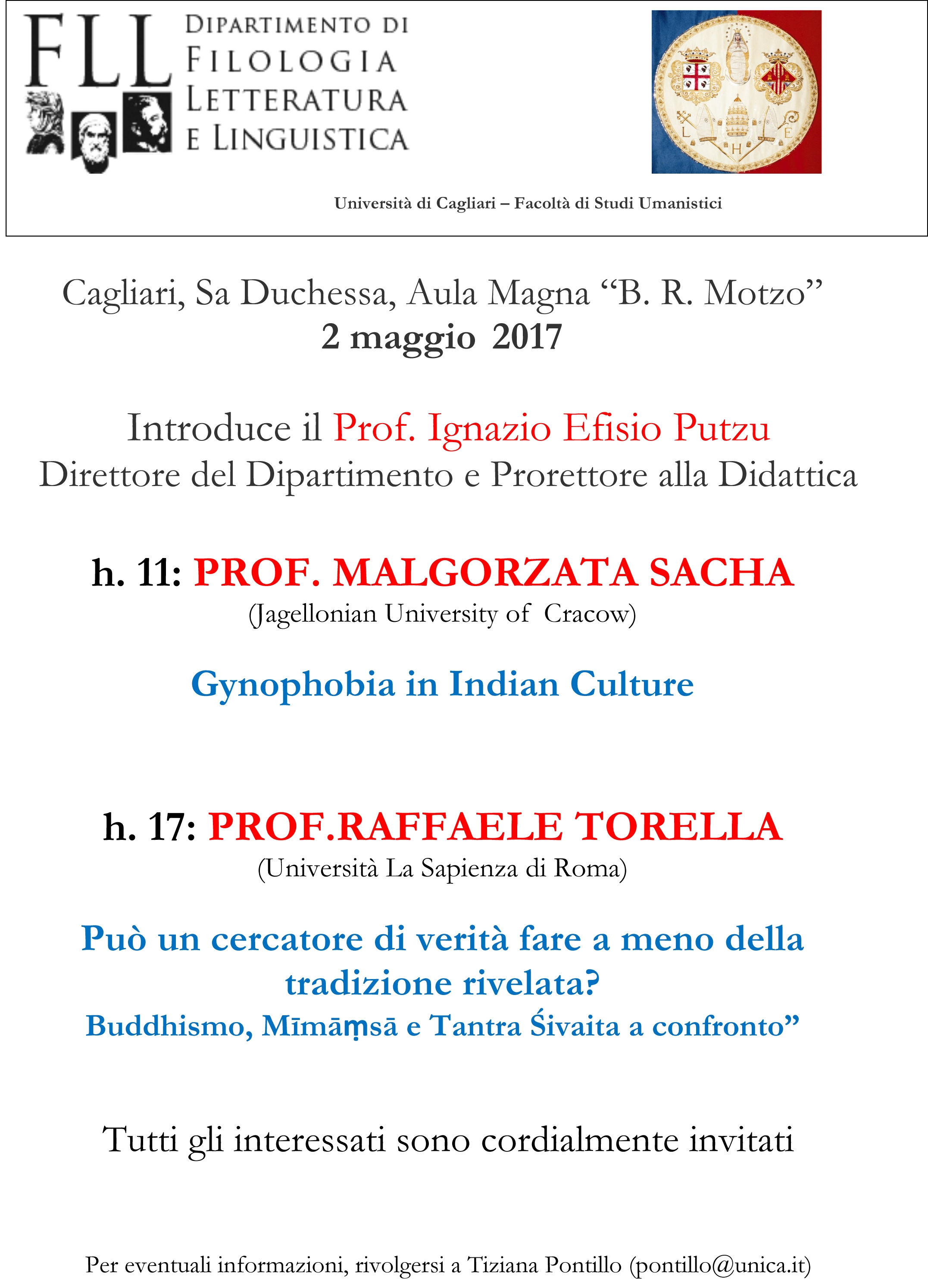 Organizzata dal Dipartimento di Filologia, Letteratura e Linguistica dell’Università di Cagliari nell’ambito della didattica di Lingua e Letteratura Sanscrita e di Religioni e Filosofie dell’India, si svolgerà a Cagliari, Sa Duchessa, Aula Magna “B.R.Motzo”, il 2 maggio 2017, la conferenza dal titolo: