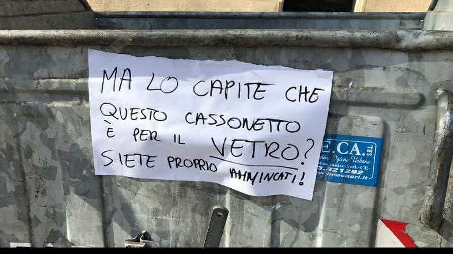 No, decisamente non l’hanno presa bene i netturbini di Cagliari per i continui errori nel conferimento dei rifiuti. Una foto in queste ore sta girando sulle bacheche social dei cagliaritani dove compare un cartello affisso in un cassonetto di viale Regina Elena: “Ma lo capite che questo è il contenitore per il vetro? E poi un epiteto non certo galante “Siete proprio amm….” Insomma, non ne possono proprio più. Il messaggio è forte e chiaro: cittadini svegliatevi! Il post è finito addirittura sulla pagina Facebook Laura Laccabadora, che ovviamente ha contribuito a rendere il messaggio virale.