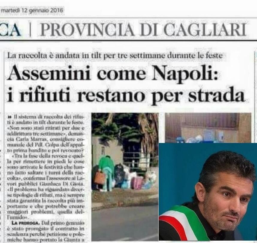 “Assemini come Napoli: i rifiuti restano per strada”. E’ questo il titolo che L’Unione Sarda di oggi nell’articolo di Marcello Zasso, ha dato per evidenziare il fatto che la raccolta è andata in tilt per tre settimane durante le feste. Problema tra l’altro denunciato da Carla Marras, consigliere comunale del Pdl del gruppo di minoranza. Al Sindaco di Assemini il titolo dato dal quotidiano cagliaritano non è piaciuto ed ha pertanto esternato tutta la sua indignazione con un post su Facebook, con queste testuali parole: «Diciamo che un viaggetto in quella “Napoli”, cui allude il simpatico titolista dell’Unione, glielo farei fare, con viaggio di sola andata. Son il primo che vorrebbe Assemini molto più pulita di come la vedo (e ci son dei giorni in cui, complice anche la nostra responsabilità, quella di chi effettua il servizio e, per finire, di qualche incivile, trovo anche io Assemini sporca) ma davvero, un titolo del genere è quanto di più falso e disonesto si possa leggere».