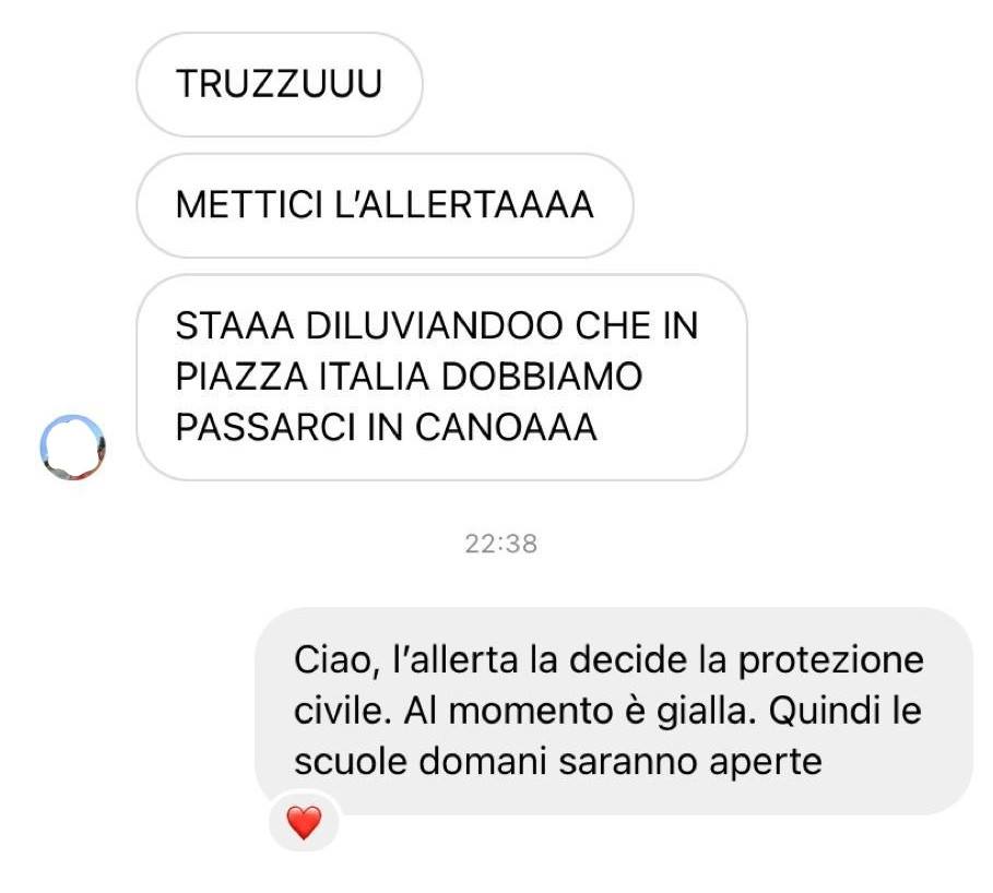 “È tutto vero, ma devo dire che mi sono divertito a rispondere ai tanti messaggi di ragazzi e ragazze che in questi giorni di pioggia mi hanno scritto sui social. Qualcuno mi ha anche scritto su WhatsApp”, ha scritto il sindaco. “tutti però mi “suggerivano” di diramare un’allerta meteo rossa.
