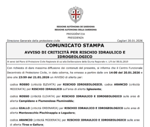codice ROSSO (criticità ELEVATA) per RISCHIO IDROGEOLOGICO, codice ARANCIO (criticità MODERATA) per RISCHIO IDRAULICO sull’area di allerta Iglesiente;