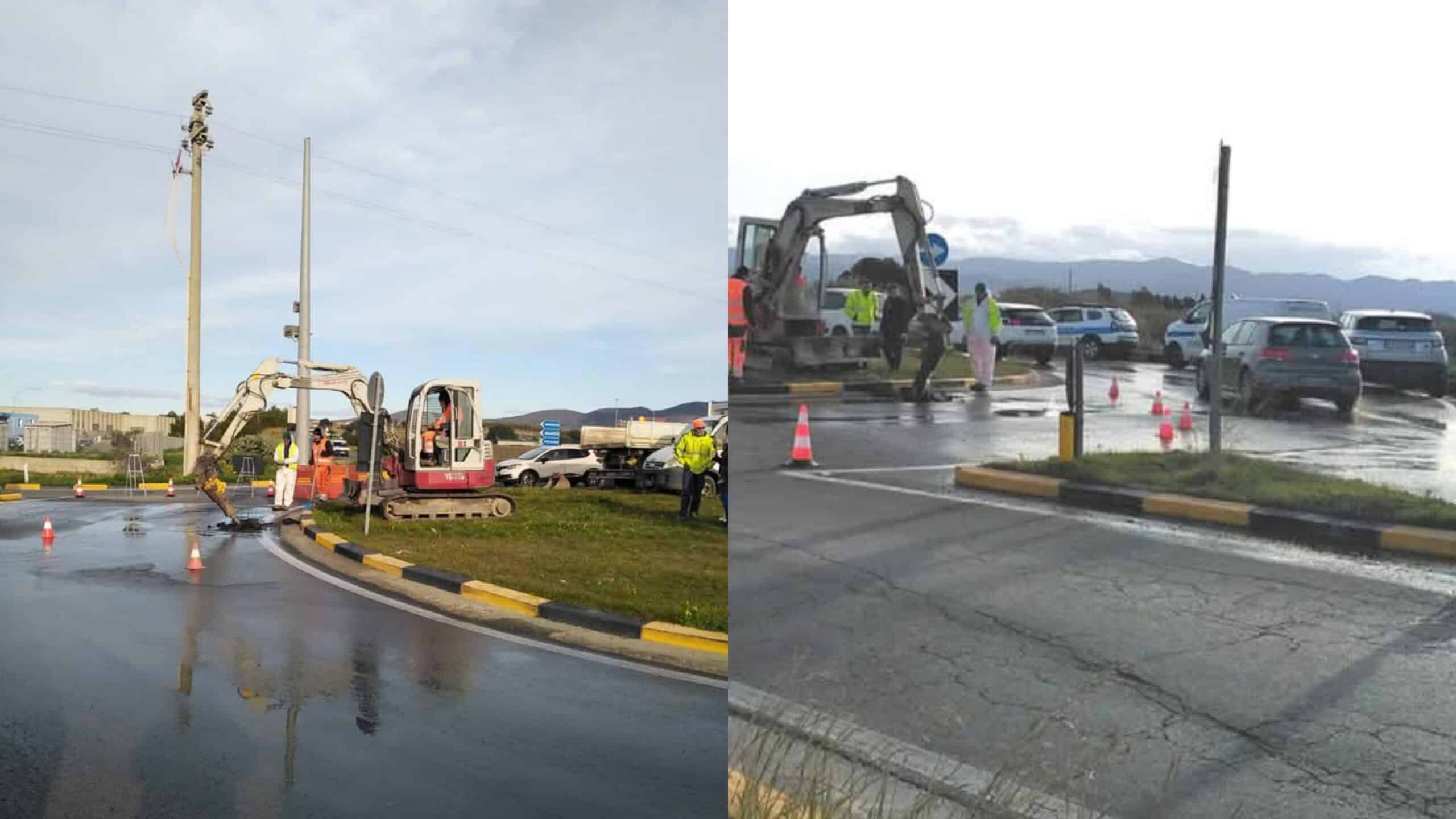 Già ieri sera la rotatoria presentava i primi segni di una perdita idrica, l’asfalto bagnato non lasciava presagire niente di buono. Oggi il “danno”: la condotta è letteralmente “esplosa”, guasto talmente importante che ha richiesto l’intervento immediato degli operai di Abbanoa. “Ci saranno sicuramente code e rallentamenti in attesa della fine lavori” spiega Fadda. Per regolare il traffico e garantire la sicurezza delle squadre degli operai, sul posto sono presenti le forze della polizia municipale.